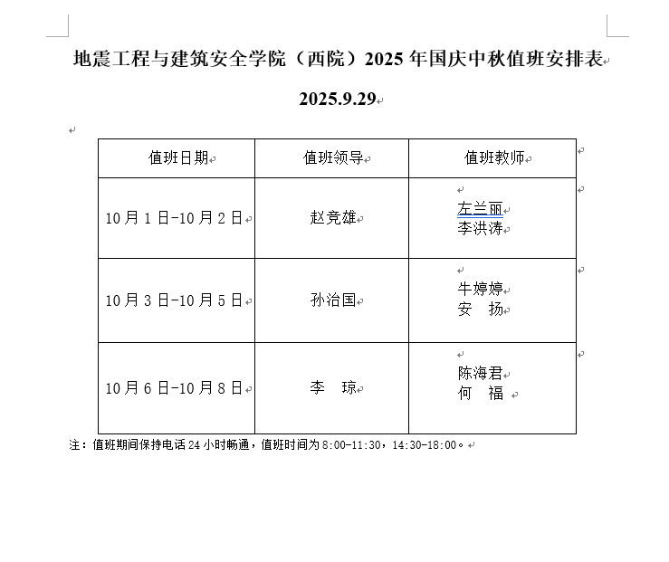 地震工程与建筑安全学院2025中秋国庆值班安排表
